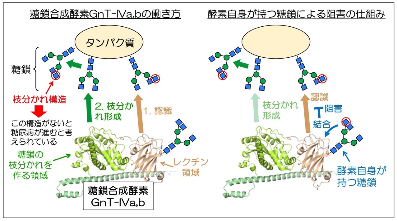 岐阜大学糖鎖生命コア研究所の木塚 康彦教授、自然科学技術研究科修了生の長田菜緒子さんらの研究グループは、ミシシッピ大学、広島大学、大阪大学との共同研究で、タンパク質に付いた糖鎖の枝分かれ構造が、この枝分かれを作る酵素の働きを抑える、つまり特定の糖鎖が自分自身の生合成を抑えるという新たな仕組みを発見しました。