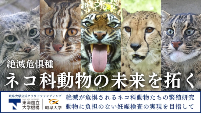 岐阜大学応用生物科学部動物繁殖学研究室 楠田 哲士 教授は、クラウドファンディングサービス「READYFOR」にて、岐阜大学公式クラウドファンディングのプロジェクト「ネコ科動物の未来を拓く!動物園との繁殖研究・妊娠検査で保全に繋げる」を公開しました。300万円を第一目標に、本日2023年11月29日(水)から2024年2月27日(火)まで寄附を募ります。