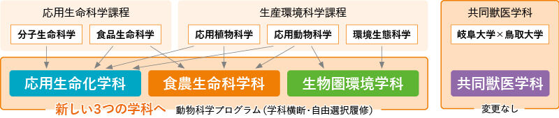 応用生物科学部は前身の農学部時代から、「人類の持続的生存と生活環境の向上への貢献」を理念に掲げ、農業に加え食品、医薬品、環境関連などの生物産業で活躍できる人材を育成してきました。今後も理念を実現していくためには、「健康で安全な生活への寄与」「安定的で高品質な食料・食品生産」「気候変動への対応や生物多様性の保全」「持続的な資源の有効活用」といった次世代社会のニーズに応える必要があります。そこで、共同獣医学科を除く従来の2課程5コースを、「生命」「食料」「環境」をキーワードとした3学科構成へと再編しました。