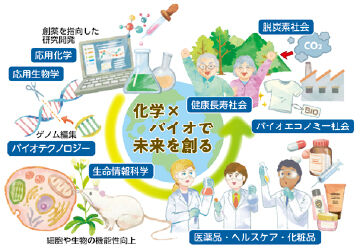 生体を分子から個体までの広いスケールで探求し、最先端化学とバイオテクノロジーの融合によって生命の基本原理や生物の多彩な機能の解明・理解・活用を図り、持続可能な未来社会の創造を目指します。健康長寿社会やバイオエコノミー社会の実現に向けた、医薬品、ヘルスケア、化粧品など、人々の暮らしを支えるさまざまな研究を行っています。