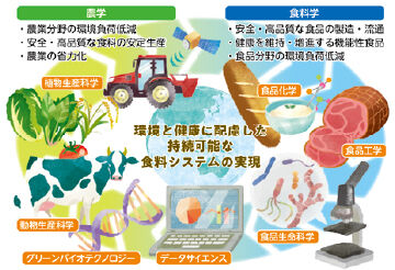 食料としての植物・動物生産から加工、流通、消費まで一連の食料システムを持続可能な形で実現し、人類の存続と地球環境の保全を両立するため、農学と食科学を融合させた知識・技術の修得を目指します。スマート農業、食品機能の解析、食の安全性確保など、環境や健康に配慮した技術とイノベーションを追求する多彩な研究を行っています。