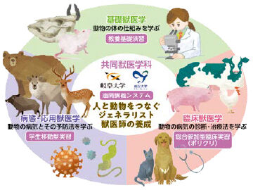 鳥取大学農学部と共同で、「動物と社会のつながり」「動物と人の健康・福祉」をキーワードに、人と動物との共生を目指し、高度な専門的獣医学教育を行います。東海国立大学機構は「One Medicine創薬シーズ開発・育成研究教育拠点」を置き、獣医学と医学・薬学・工学の融合による創薬の最先端研究を行っているのも特色です。