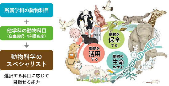 「応用生命化学科」、「食農生命科学科」、「生物圏環境学科」の3つの学科を横断して動物科学を学ぶ、自由選択のプログラムです。動物科学プログラムに登録して学ぶことで、所属する学科に加え、他学科の動物科学に関する講義も受講し、動物への包括的理解を深めながら、学科ごとの専門性を向上することができます。