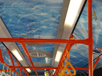 車両の特徴は,全長18メートル,前後2か所から乗車が可能で,低床・バリアフリーとなっています。外装は街なかでも映える鮮やかな赤色で,天井には愛称「清流ライナー」をイメージ化した長良川の鮎が優雅に泳ぎます。