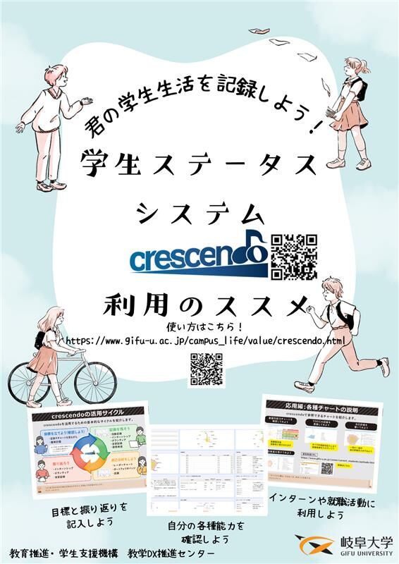 岐阜大学では令和5年度10月より、学修成果に関する情報を的確に把握し可視化するWebシステム「crescendo(クレッシェンド)」を導入いたしました。 このシステムでは岐阜大学が基盤的能力として取り組む『進・伝・考』(進める力、伝える力、考える力)をさらに定着させるためのさまざまなアプローチを提供するとともに、成績や大学内外の活動を記録することで大学生活の「学び」が最大になるよう達成度を自己確認することができます。