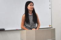 During the ceremony, Ms. Yang Xinyi from University of Electronic Science and Technology of China (China) and Ms. Ko Migyeong from Mokpo National University (South Korea) expressed their gratitude to teachers on behalf of Japanese Language and Culture Studies course students and had a speech about memories during their stay in Japan, improving their Japanese skills, making Japanese friends, and how difficult to complete a final thesis was.