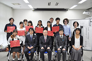 On August 20, the International Student Center held a closing ceremony for Japanese Language and Culture Studies Course and the Japanese Society and Culture Program, at the Business Incubation Center. The ceremony was attended by eight international students who enrolled at Gifu University last October: seven of the students completed Japanese Language and Culture Course, and one student completed the Japanese Society and Culture Program. Dr. Fumiaki Suzuki, Executive Director for International Affairs and Public Relations attended the event as a guest.