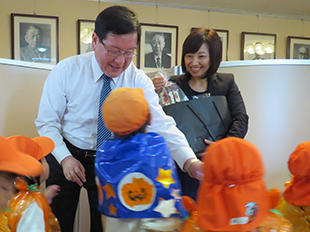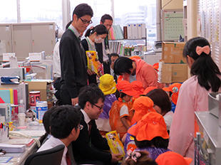 When the children entered the Office calling out, "Trick or treat?" they were warmly welcomed by President Hisataka Moriwaki and Ms. Miki Tsukiyama, Secretary to the President, and they were given a boxful of sweets and snacks.