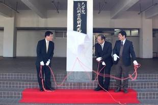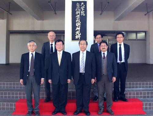 At the entrance of the Faculty of Engineering building, a Signboard Hanging Ceremony was held to commemorate an establishment of the new Graduate School of Natural Science and Technology. In his speech, Professor Shuichi Nonomura, the School's Dean spoke about the ideals of the new school. He also mentioned that the school name on the signboard was a hand-written calligraphy by Associate Professor Naruse Yuji with the Faculty of Engineering. Later, President Hisataka Moriwaki, Professor Nonomura and Professor Sugiyama, the School's Vice Dean attended a signboard unveiling ceremony. In front of the signboard, a commemorative photo was taken with all participants at present.
