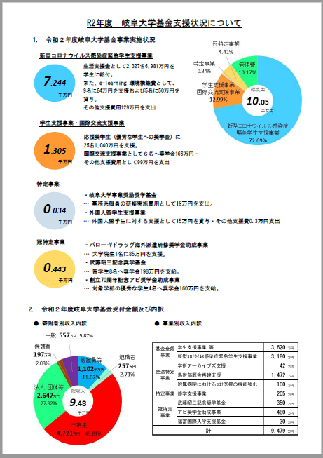 令和3年度も昨年度に引き続き学修支援など様々な事業を実施しています。皆様には、今後なお一層の岐阜大学基金へのご支援、ご協力を賜りますよう切にお願い申し上げます。