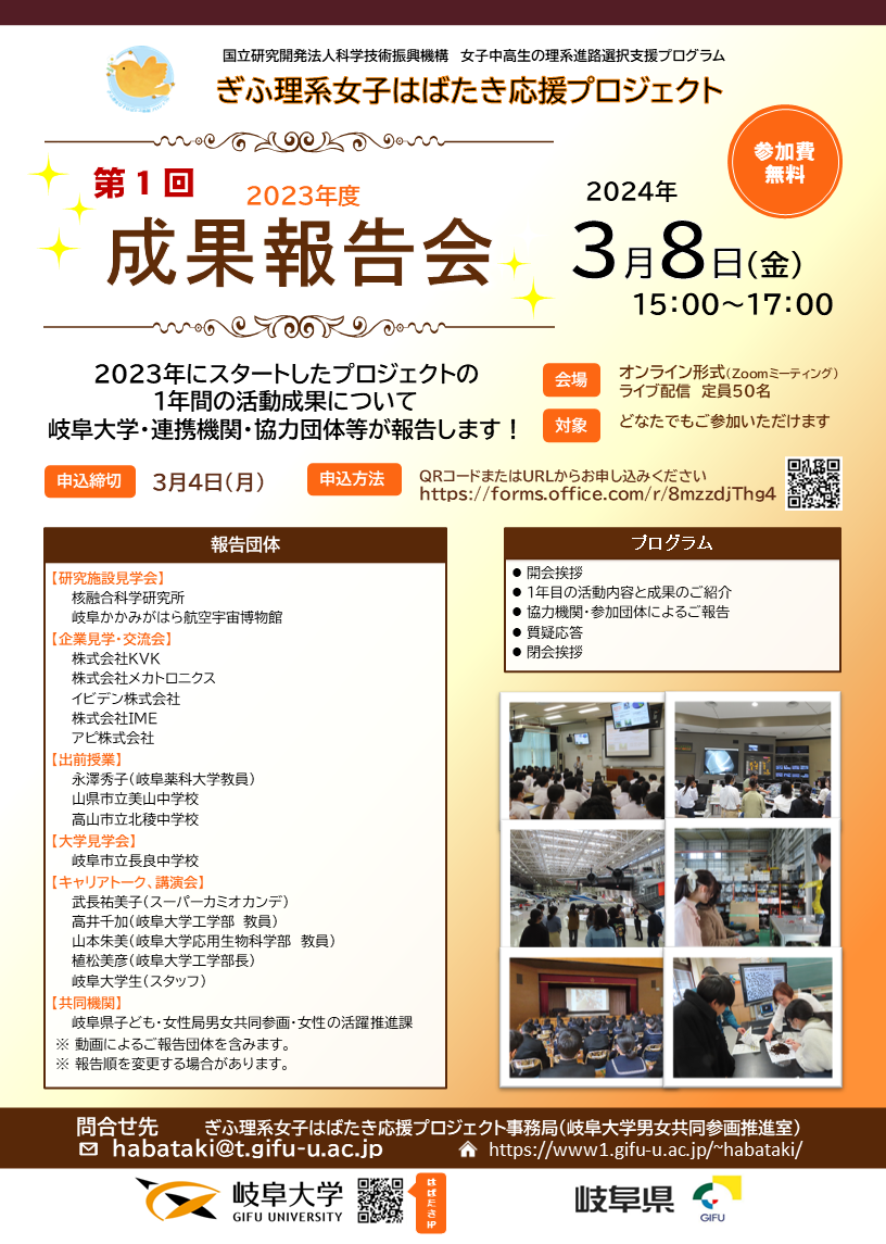 岐阜大学・連携機関・協力団体等が、2023年度にスタートした「ぎふ理系女子はばたき応援プロジェクト」の1年間の活動成果について報告します。本事業にご関心のある方々のご参加をお待ちしております(※要申込)。