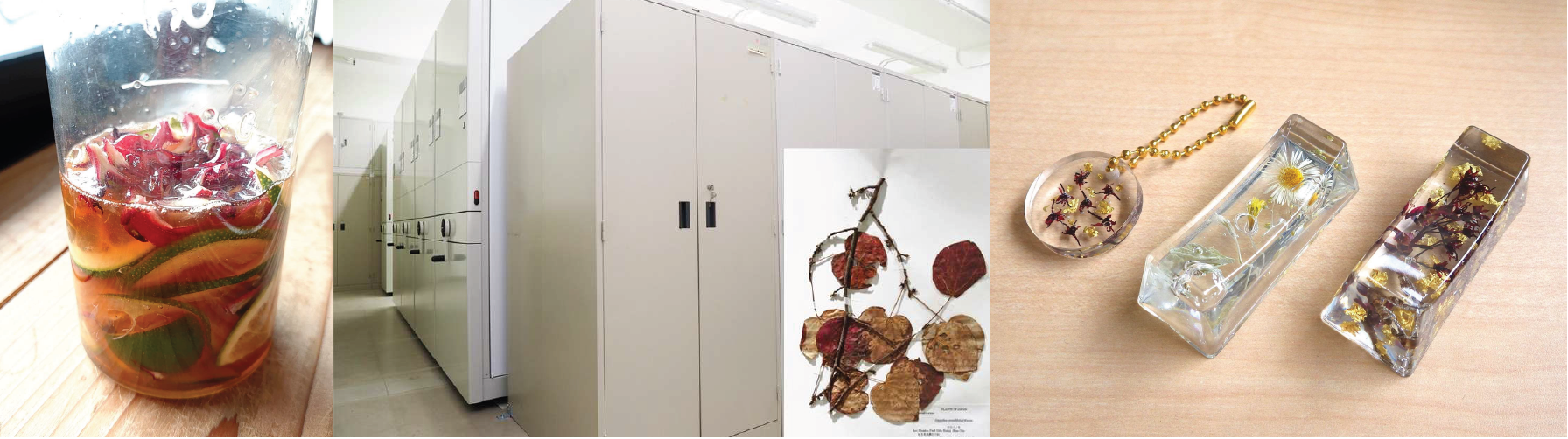 植物標本の作製に加えて、野外での植物観察、植物資料を利用したハーバリウム・グッズ作成、さまざまなハーブを使った学習を通じて身近な植物に親しみます。