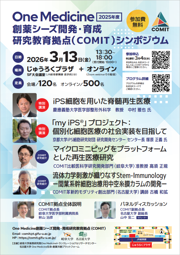詳細は、【関連リンク】2025年度One Medicine創薬シーズ開発・育成研究教育拠点シンポジウム開催のお知らせ(COMIT Webページ)をご覧ください。