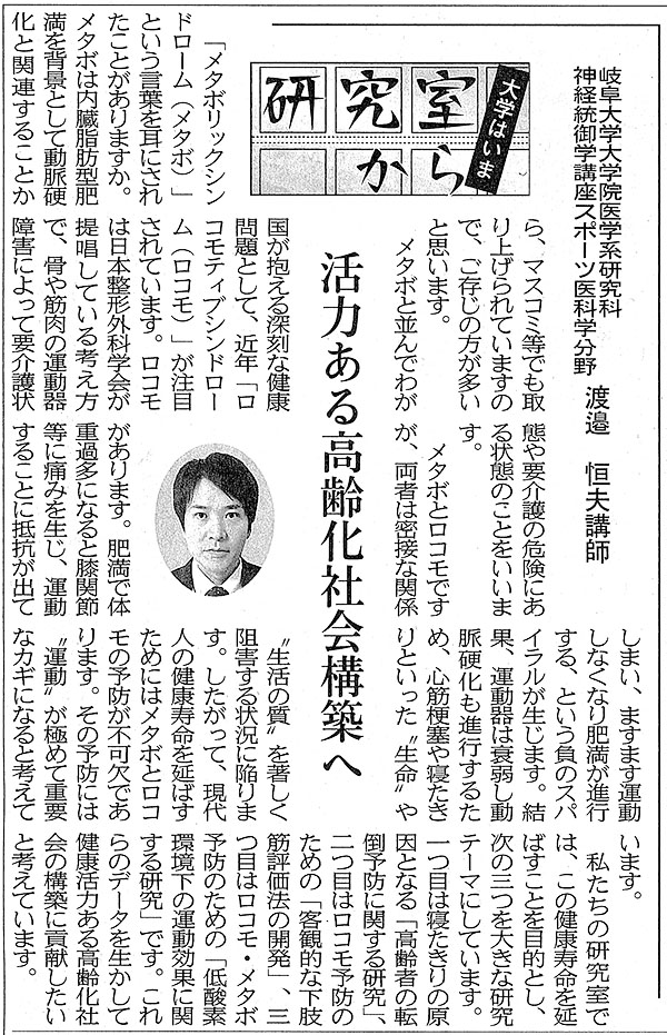 活力ある高齢化社会構築へ(医学系研究科:渡邊恒夫 講師) 2013.08.20 医学系研究科・医学部 LINEで送る シェア ポスト (岐阜新聞 平成25年08月20日朝刊から転載) 医学系研究科 神経統御学講座スポーツ医科学分野 (渡邊恒夫 講師)