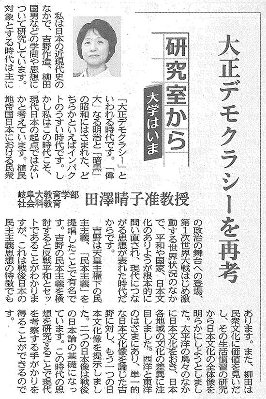 大正デモクラシーを再考(教育学部:田澤 晴子 准教授) 2018.05.15 教育学研究科・教育学部 LINEで送る シェア ポスト (岐阜新聞 平成30年5月15日朝刊から転載) 教育学部社会科教育講座(田澤 晴子 准教授) 関連リンク 教育学部/教育学研究科Webページ