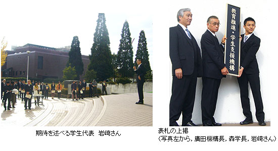 式では,森秀樹学長から「機構は学内の隅々まで目配りし,学生目線に立った教育を進める覚悟で作った」との挨拶があった後,廣田則夫機構長が機構の概要について説明しました。続いて,学生代表の工学部3年岩崎誠さんは,「この機構は,学生スタッフがこれまで以上に参画することが期待されているので,岐阜大学の教育改善に学生として積極的に参加したい。また,学部の垣根を取り払って交流を深め、学生同士が互いに切磋琢磨し成長していきたい」と期待を熱く語り,その後,森学長と岩崎さんが表札を掲げました。