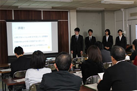 岐阜県庁チームの最終報告は,12月26日(木)に岐阜県庁で関係者など17人を集めて行われました。このチームには,県商工労働部から岐阜県内の中小企業における『グローバル人材の育成』に関わる課題が与えられ,中間発表で受けた指摘をもとに,その後1ヶ月間で,新たにアンケートや調査等を実施,検討した結果を踏まえ,『海外進出を考えている中小企業に,国際業務経験を持つ定年退職者や,外国語に堪能だが出産等で退職した女性を再雇用して派遣する』という案を提案しました。これを受けた県商工労働部からは,『大変おもしろい仕組み』と評価をいただきました。