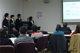 民間企業の5社,岐阜県庁商工労働部および本学キャリアセンターから提供された課題に対して約半年間にわたり合計7チームが本プログラムに取り組みました。11月に行った中間発表で指摘を受けた後,各チームが調査の追加やさらなる検討を加えた企画・立案について,それぞれの企業の本社等での会場で多くの参加者のもとプレゼンテーションいたしました。