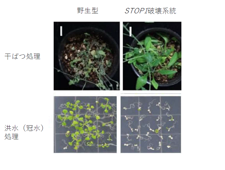 図1:STOP1遺伝子破壊系統の干ばつ耐性と洪水(冠水)処理耐性