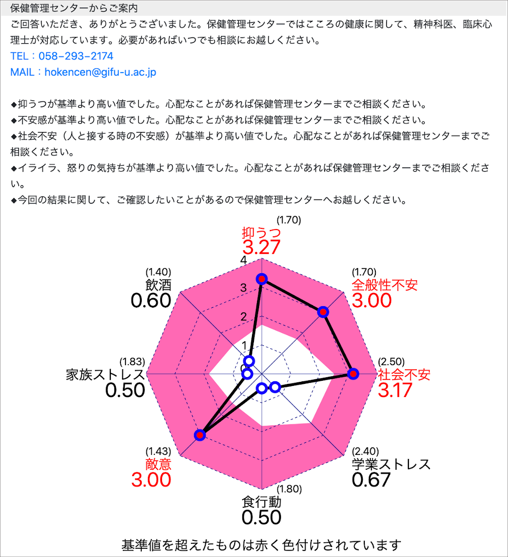 新型コロナウイルス感染症の拡大は未だ終息に至らず、大学生のメンタルヘルスへの影響は大きな社会問題となっています。本システムは、回答した学生に対して自動かつ即時に結果がフィードバックされ、相談窓口の連絡先や、結果に応じた相談を促すメッセージも表示される機能を搭載しています(図1)。このような機能は他に類を見ないもので、その研究成果と意義が高く評価され、日本学生相談学会発行の学生相談研究に掲載されました。本システムは岐阜大学をはじめ、複数の大学ですでに実装されています。